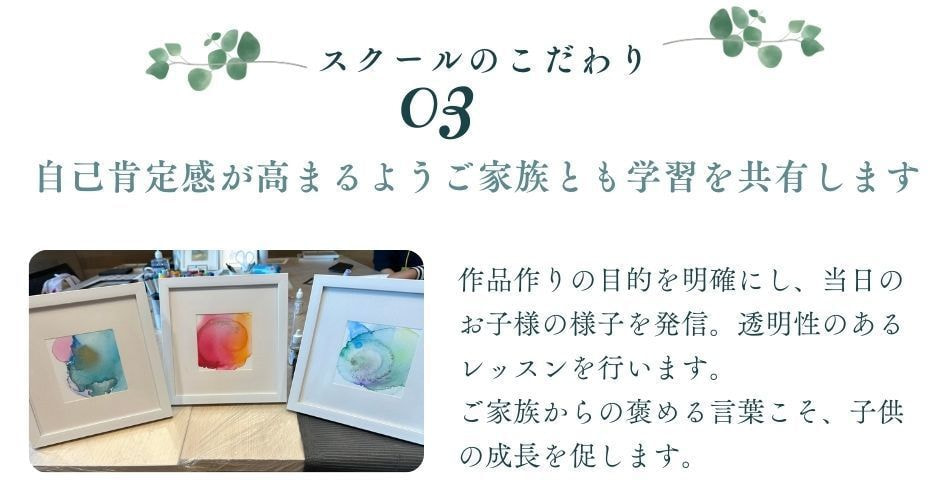 世界では創造性が大切とされるSTEAM(スティーム)教育が推奨され始めました。アートは、全ての学問にクリエイティビティを発揮させる重要な土台を作ります。アルコールインクアートは、色の流れる様子や混ざりゆく様子など様々な美しさを同時に感じることができる誰でも楽しめるアートです。偶発的に生まれる色やカタチから、子どもたちの創造力を刺激し、世界に一つだけのオリジナリティー溢れる作品を完成させることができます。「失敗のないアート」だからこそ成功体験を積み重ねることができ、自己肯定感も高まります。初めての習い事にもおすすめです。安心してご参加ください。