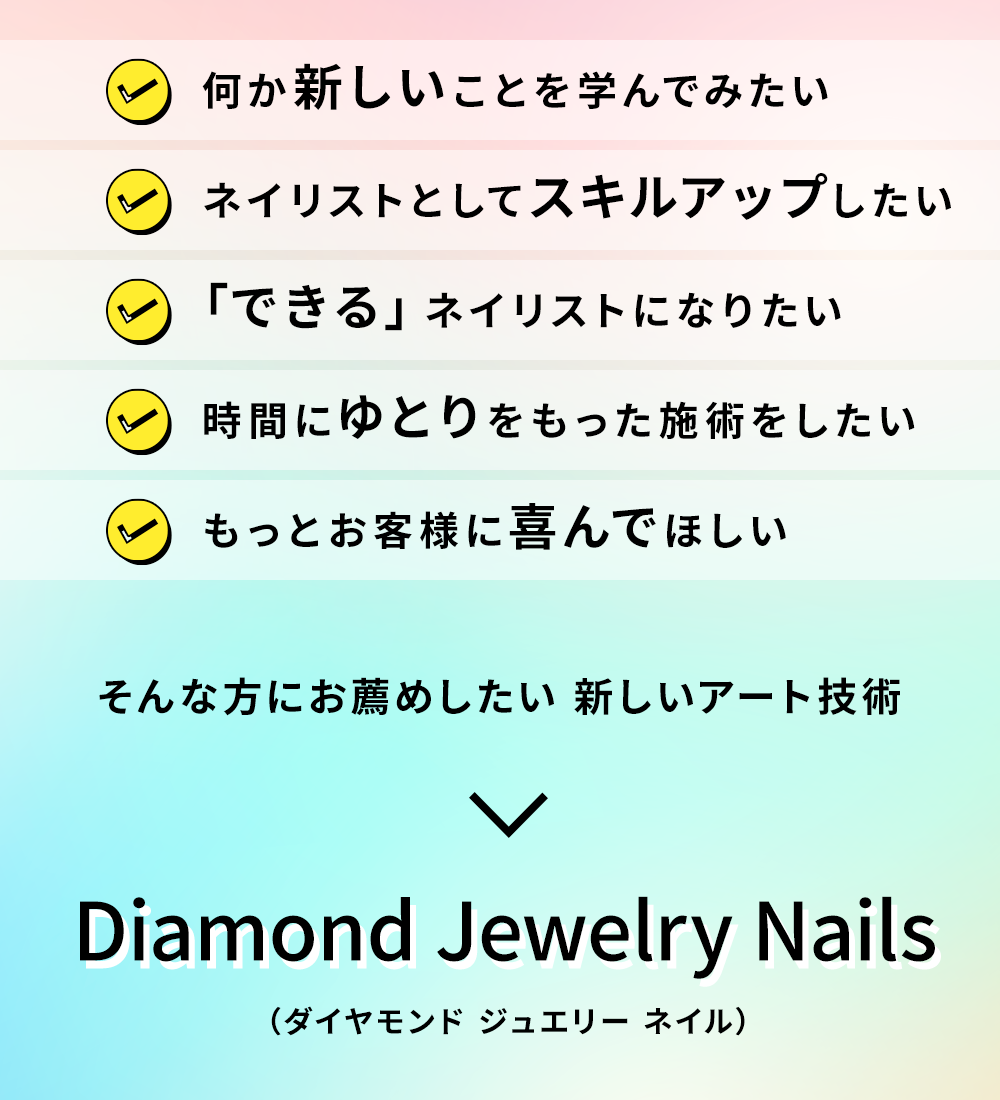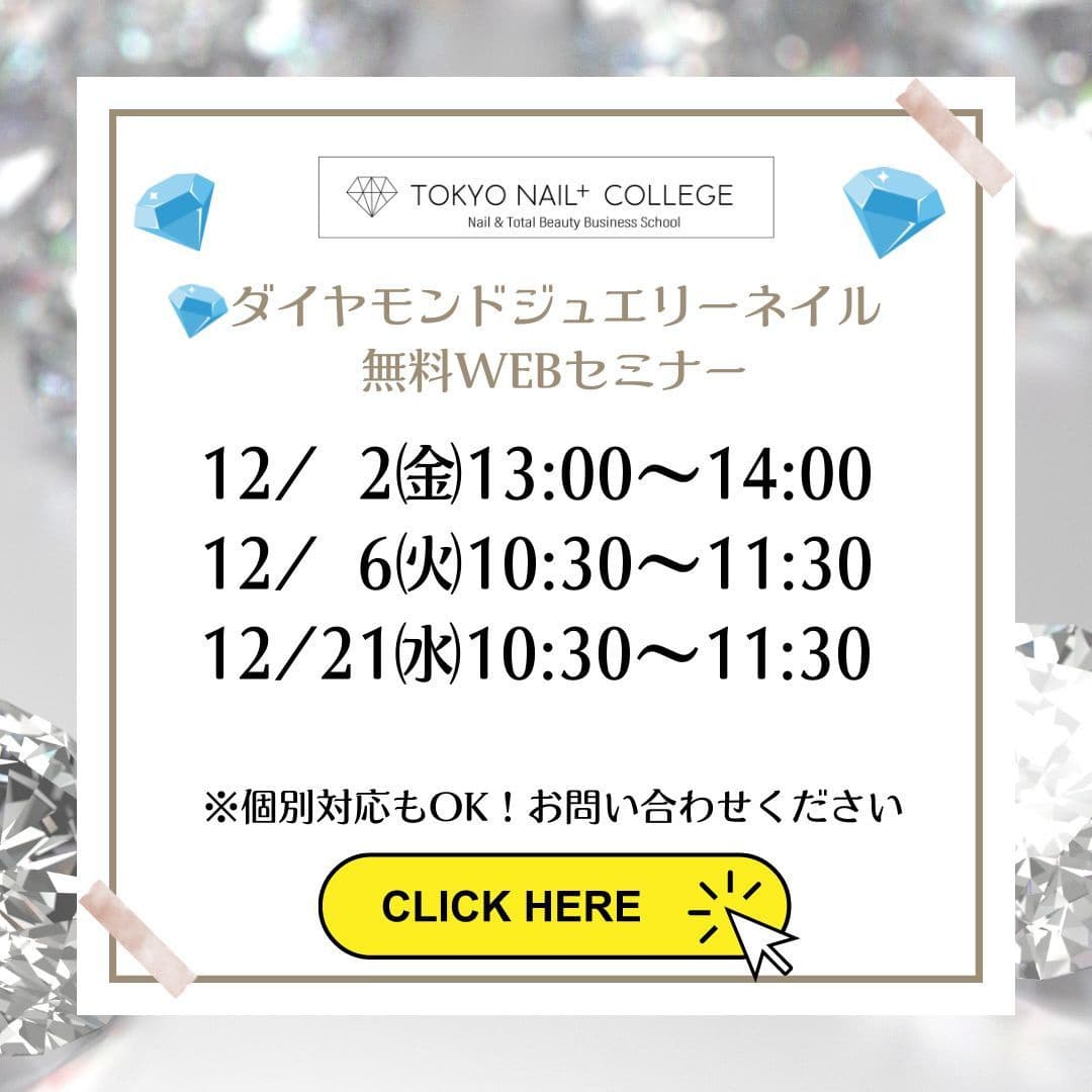 TOKYO NAIL+ COLLEGEで学べるダイヤモンドジュエリーネイルは、アート技術を身につけられることはもちろんですが、実際にサロンで再現できる他にはない「大切な成功ノウハウ」もお伝えするものです。初めてこの技術を知る方も、知ってはいるけれどもその実態を知らない方も、その技術の本質や魅力をぜひ感じてください。技術を身につけて、一緒にスキルアップしましょう!