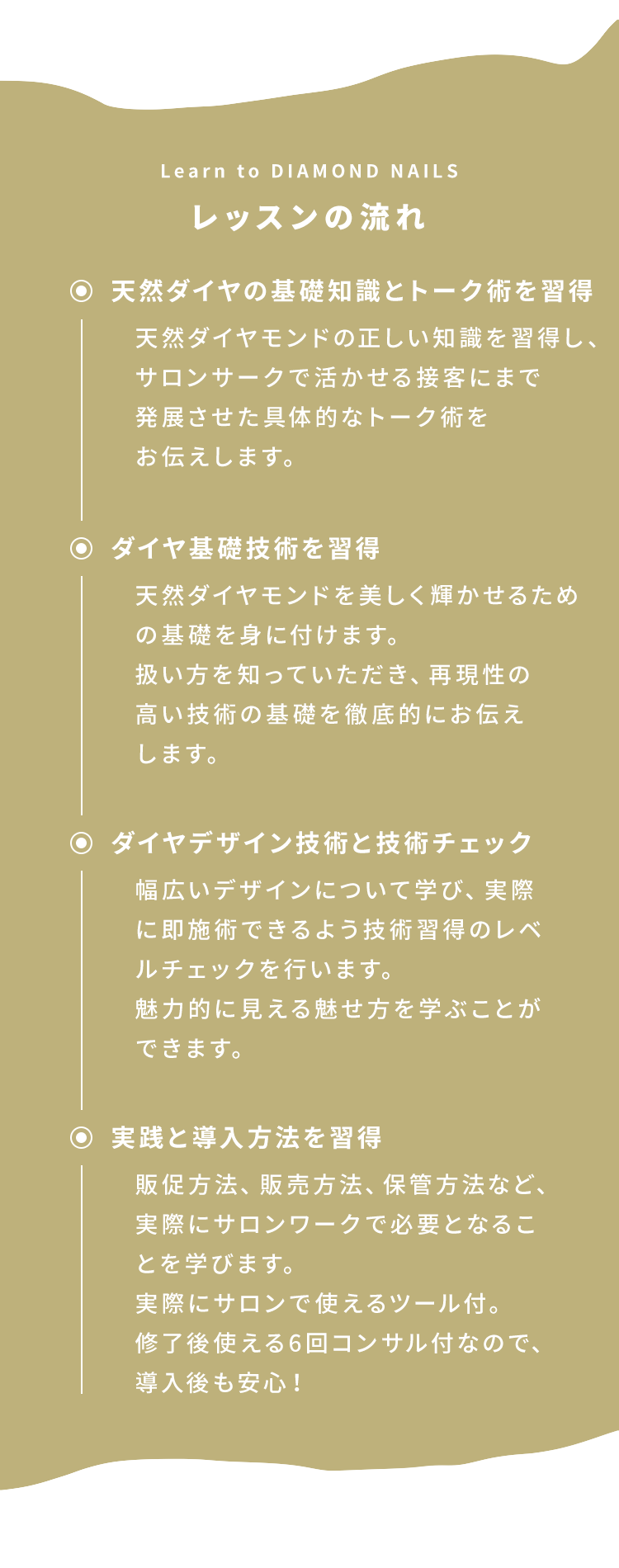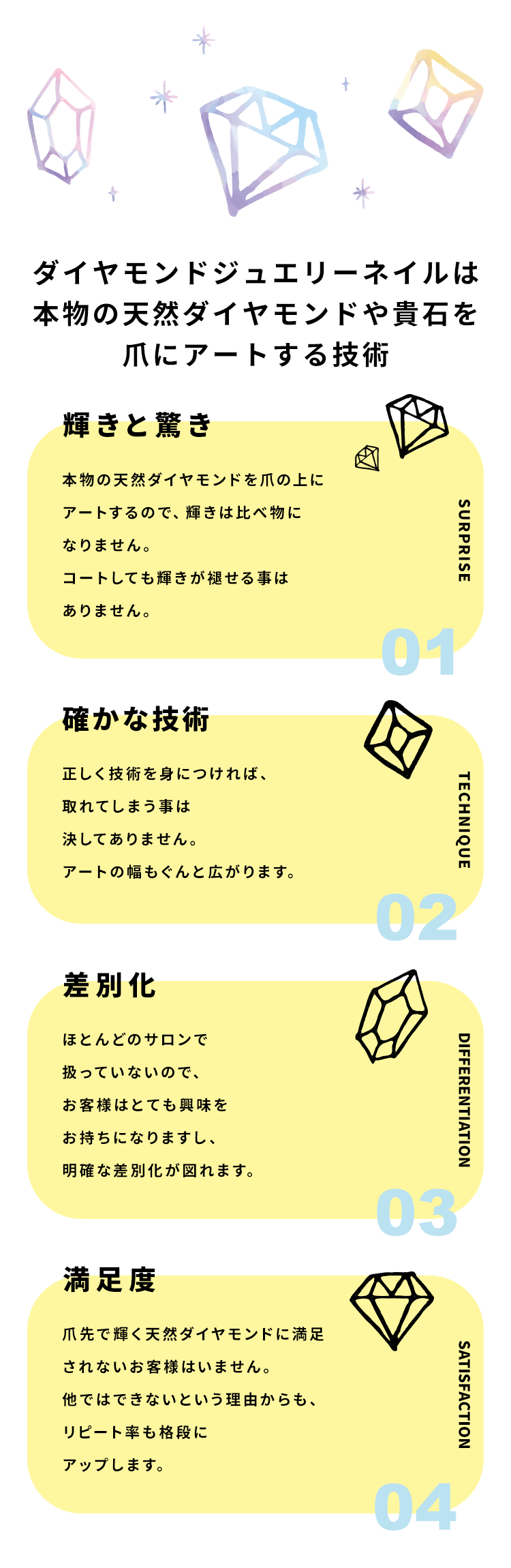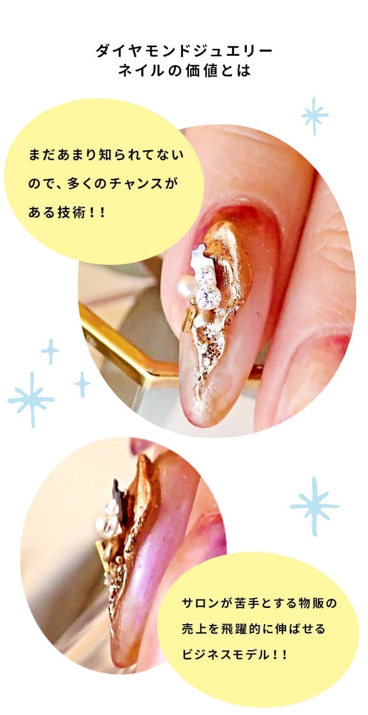 ダイヤモンドジュエリーネイルは、技術として持っていても、その販売方法を知らなければ、飛躍的な売上にはつながりません。約7年に渡り実践してきた独自の販売方法を身につけ、差別化されたダイヤモンドジュエリーネイルメソッドをしっかり身につけて下さい。