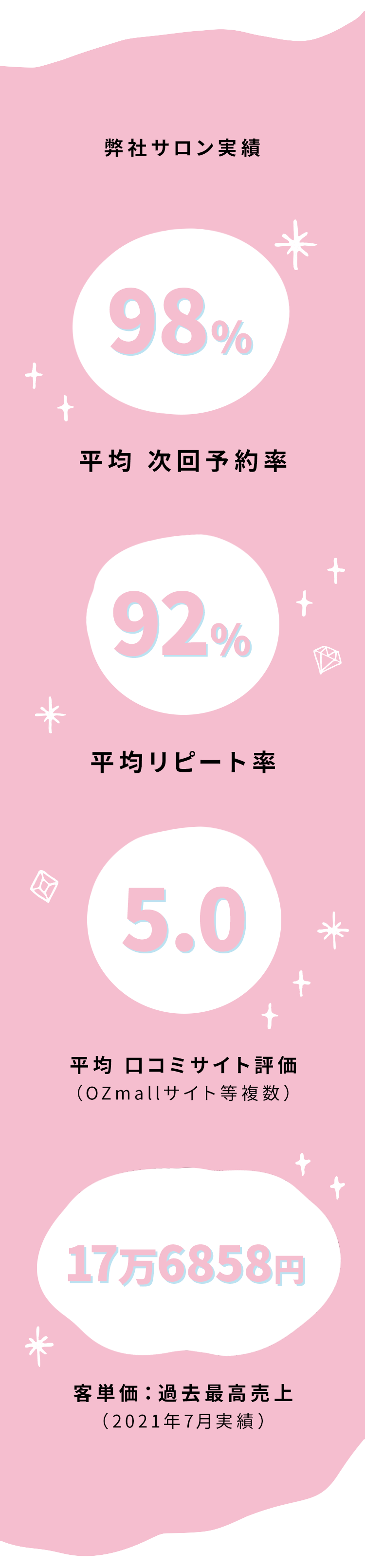 天然ダイヤモンドのような高価なものをを取り扱うようになってから、正直自分の動作が変わりました。それに伴いお客様のお褒めの言葉も多くなったと思います。今までが悪かったわけではないと正直思いますが、天然ダイヤモンドを扱う技術者としてふさわしくなりたいと思った結果だったと思います。今はほぼ指名のお客様の施術をしています。(歴12年38才)