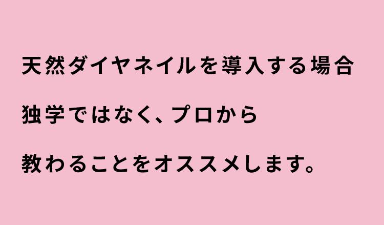 ダイヤモンドジュエリーネイルをやらない方が多いだろうと思っていましたが、天然ダイヤをつけている、わたしの手を見て「やってみたい」とおっしゃっる方もいて、自然と単価が上がってきました。ダイヤモンドジュエリーネイルを導入しただけなのに、高いサロンだとお客様が思ってくださったようで良質と言われるお客様に出会えるようになりました。「天然ダイヤモンドを増やせばこんなデザインができるのね」とInstagramを見て天然ダイヤモンドを購入くださる方も増え、サロン運営がとても楽になりました。(歴8年34才)