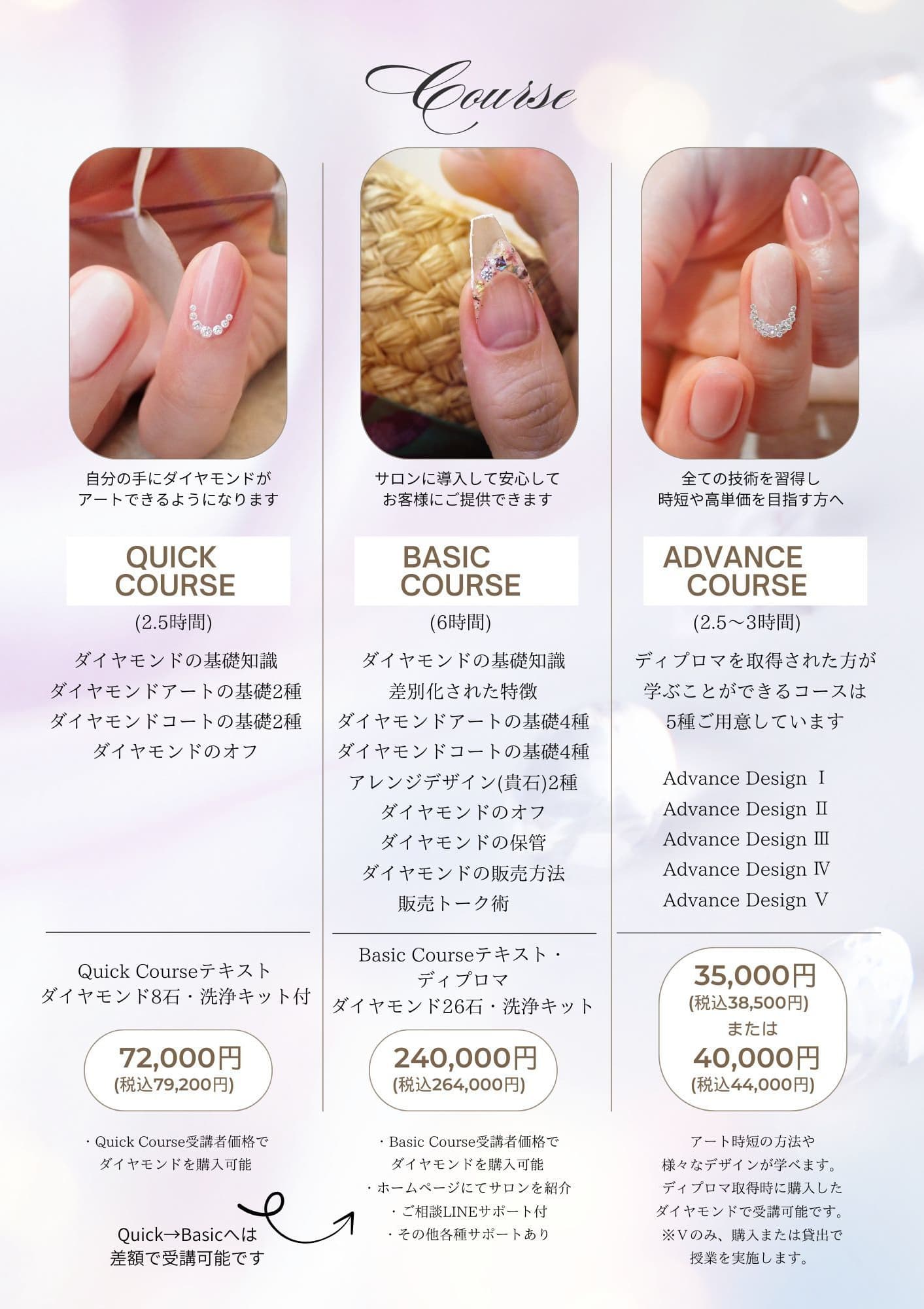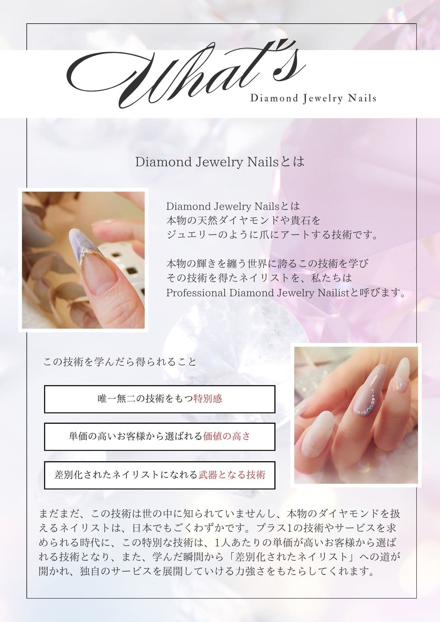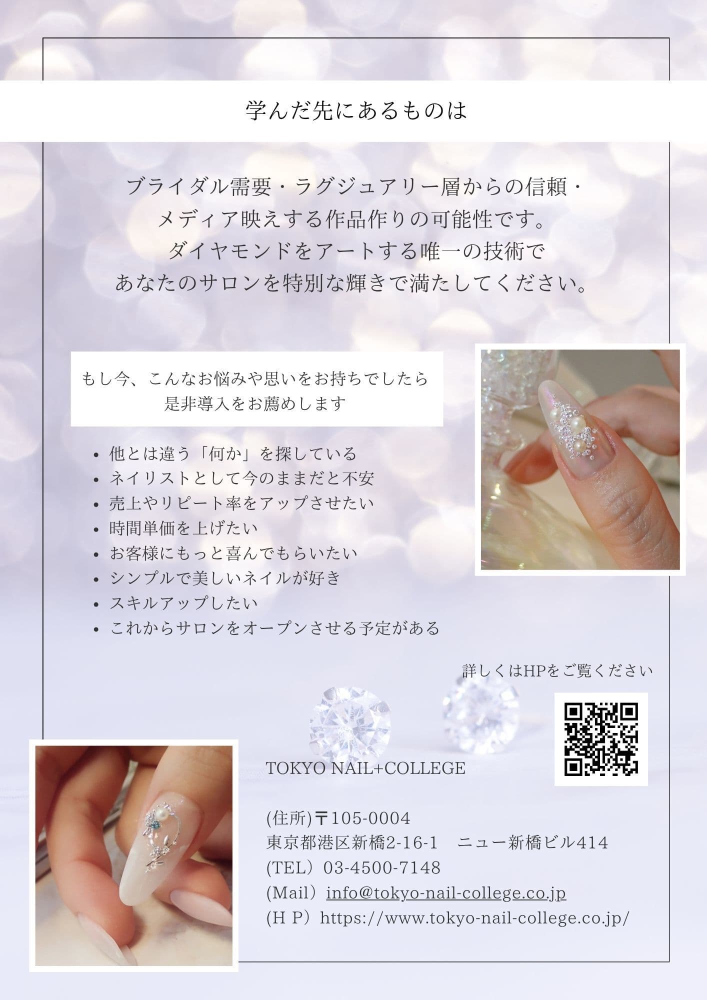私たちが約7年に渡り実践し蓄積されてきた独自の販売ノウハウを習得していただき、また導入成功サロンのオーナーからサポートを受け、ご自身のサロンでダイヤモンドジュエリーネイル導入成功をしていただきたいと思います。