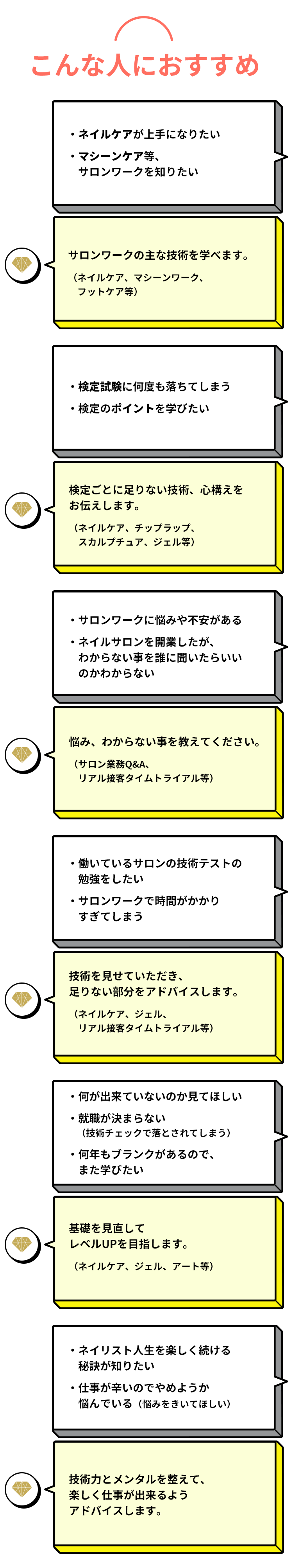 ネイルが大好きでネイルスクールに通い、検定も合格したけど、卒業後にサロンで働くことができない方や、ネイリストとして自信を持てないでいる方が多くいらっしゃいます。